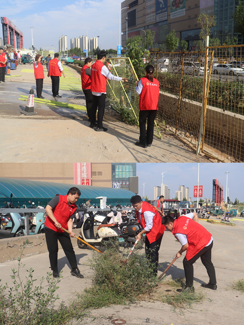 9月24日,新商城運(yùn)營(yíng)公司黨支部組織開展“環(huán)境衛(wèi)生整治”主題黨日活動(dòng),弘揚(yáng)“奉獻(xiàn)、友愛、互助、進(jìn)步”的志愿精神?;顒?dòng)中,黨員志愿者身著紅馬甲,協(xié)作拆除商城外圍陳舊圍擋,清理地面雜草垃圾,并拿起水管,給周邊綠化帶中的植物澆水,草叢在灌溉下愈顯生機(jī)。